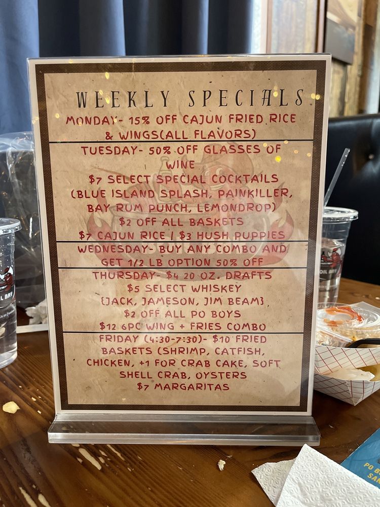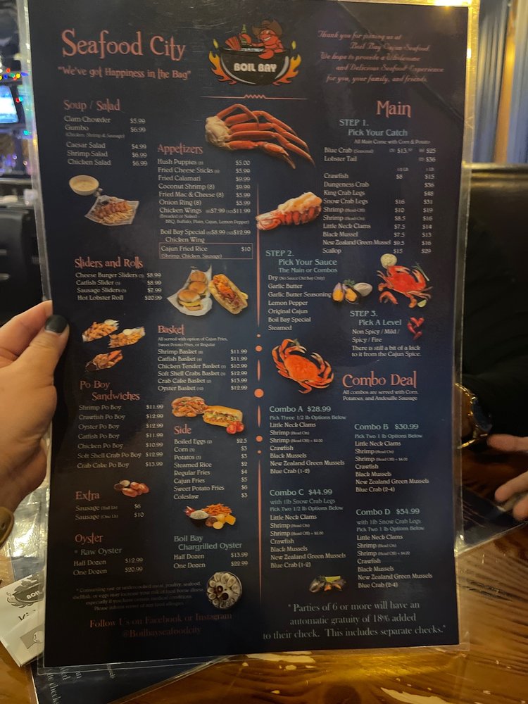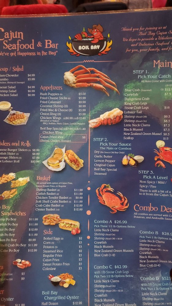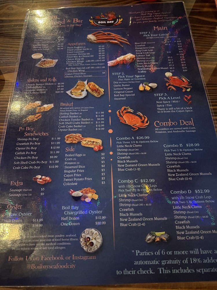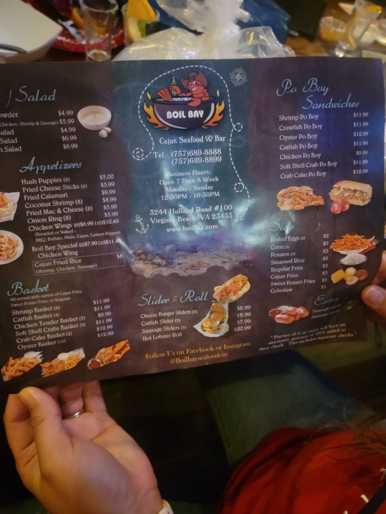 Introducing the menu at Boil Bay, a trendy and casual seafood restaurant in Virginia Beach. Offering a variety of appetizers, from Cajun Fried Rice Shrimp to Coconut Shrimp, there is something for everyone. Their hearty soups and salads, like Gumbo Soup and Chicken Salad, provide tasty options for those looking for a lighter meal. The baskets, including Catfish and Oyster options, are perfect for seafood lovers craving a satisfying meal. Customers praise the generous portions and flavorful boils, with some highlighting the fantastic lobster tails and snow crab. The lively atmosphere and attentive staff make dining at Boil Bay a memorable experience. Whether you're a seafood enthusiast or just looking for a delicious meal, Boil Bay is a must-try destination with its diverse menu and inviting ambiance.