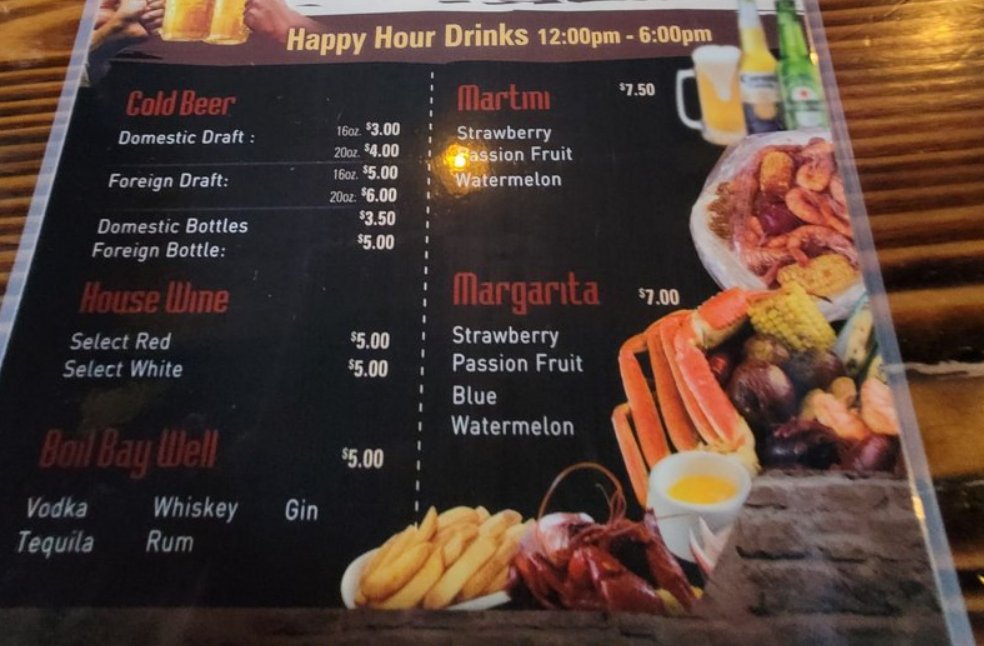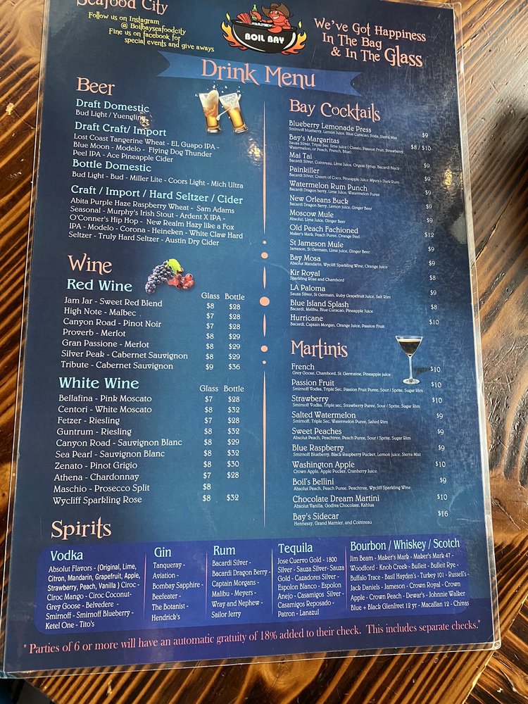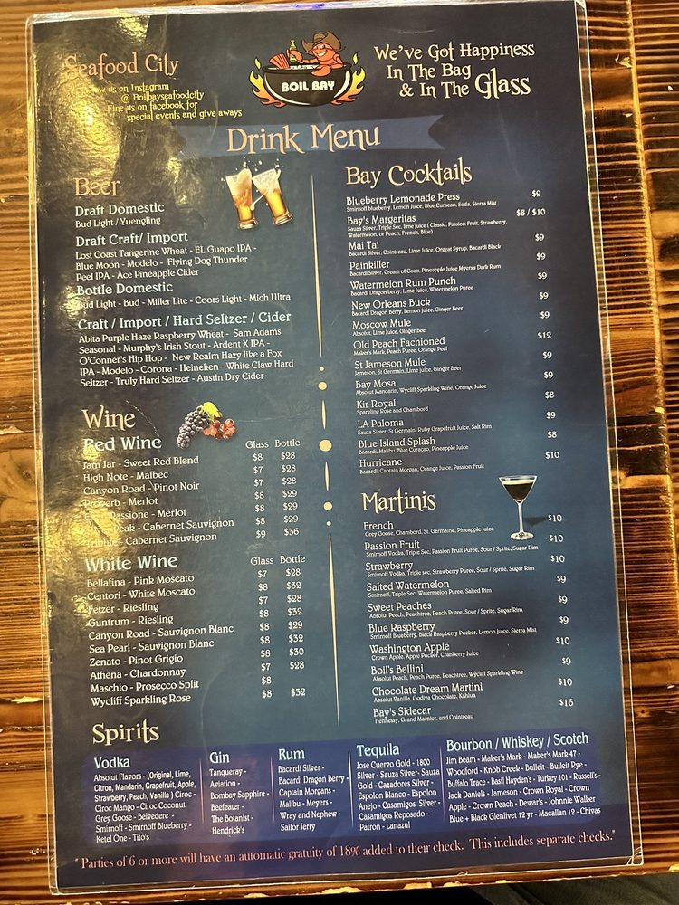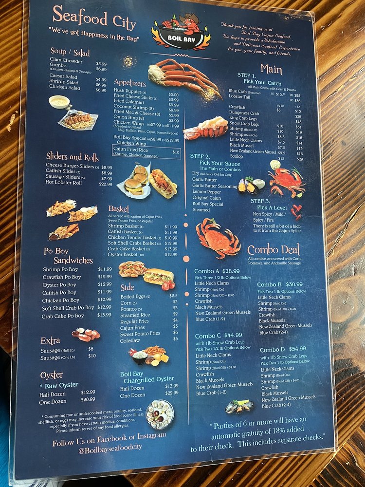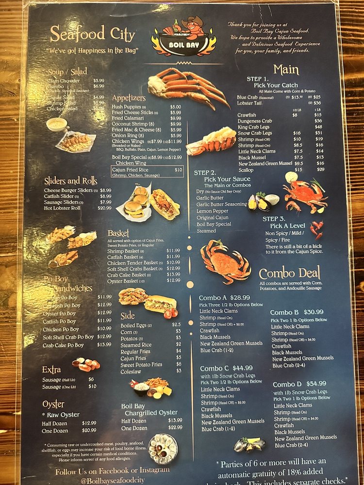 Introducing the menu at Boil Bay, a trendy and casual seafood restaurant in Virginia Beach. Offering a variety of appetizers, from Cajun Fried Rice Shrimp to Coconut Shrimp, there is something for everyone. Their hearty soups and salads, like Gumbo Soup and Chicken Salad, provide tasty options for those looking for a lighter meal. The baskets, including Catfish and Oyster options, are perfect for seafood lovers craving a satisfying meal. Customers praise the generous portions and flavorful boils, with some highlighting the fantastic lobster tails and snow crab. The lively atmosphere and attentive staff make dining at Boil Bay a memorable experience. Whether you're a seafood enthusiast or just looking for a delicious meal, Boil Bay is a must-try destination with its diverse menu and inviting ambiance.